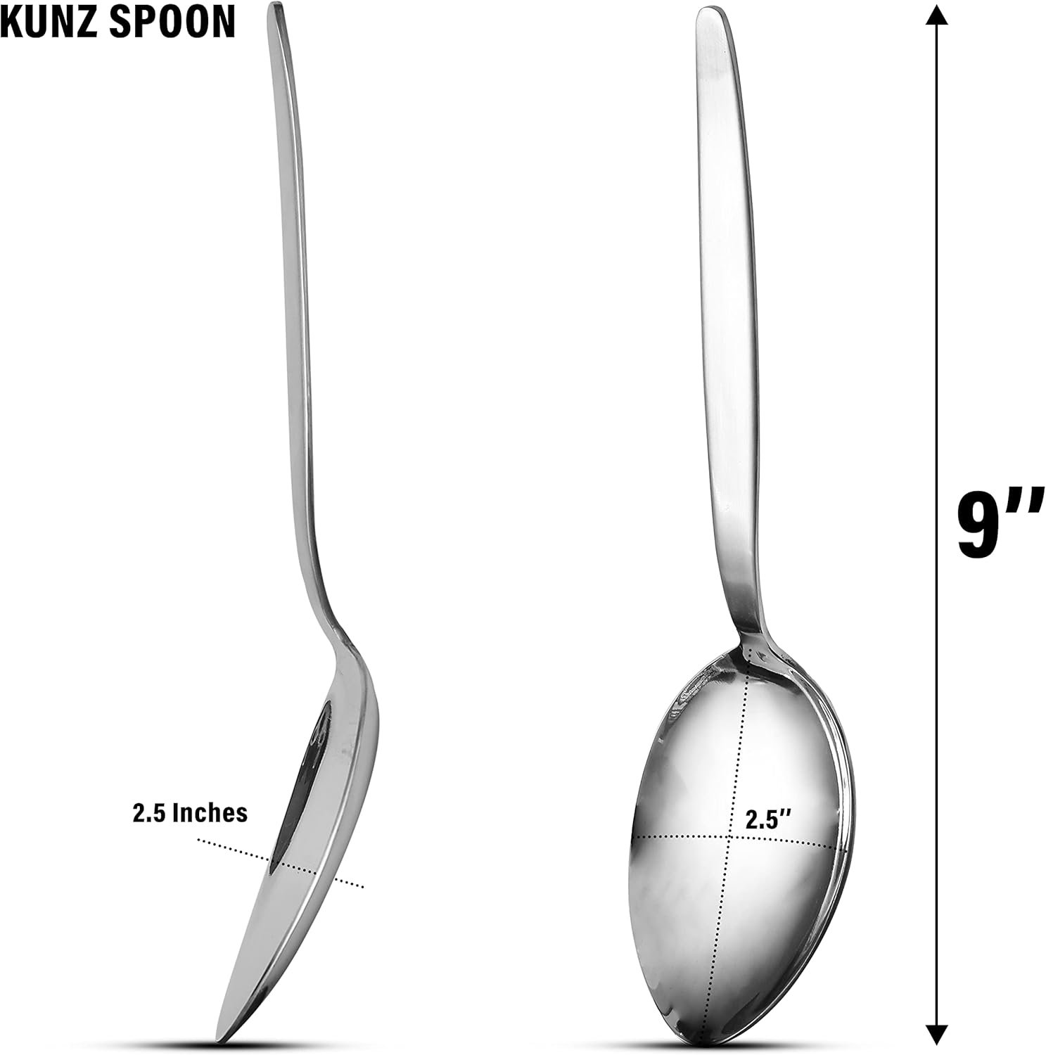 • ERGONOMIC DESIGN and MEASUREMENTS: Kunz Classic Chef Spoon features an ergonomic design, ensuring a comfortable grip and ease of use for both amateur and professional chefs. It is 9 Inch Long Cooking Spoon Silverware Holds 2.5 Inch wide Tasting Spoons (about 40 ml).