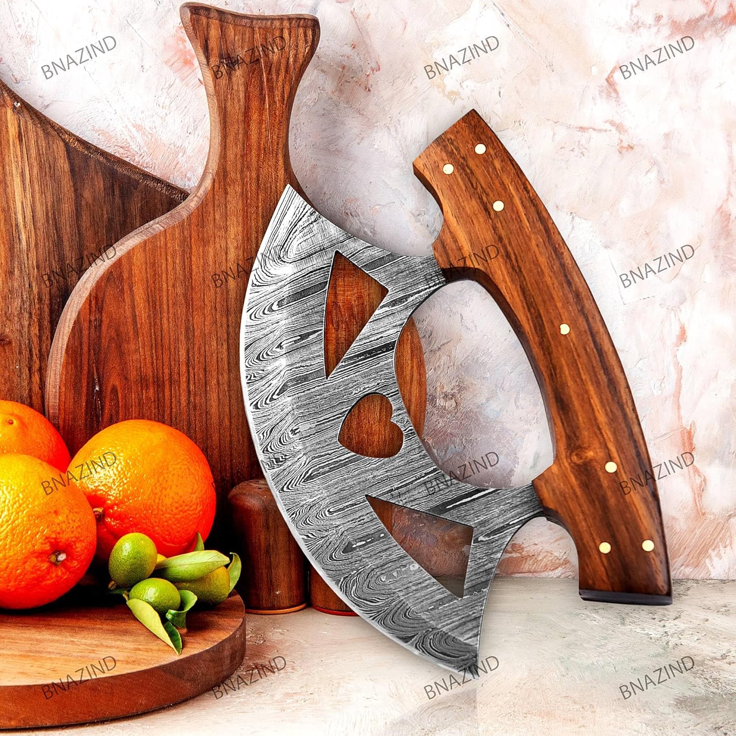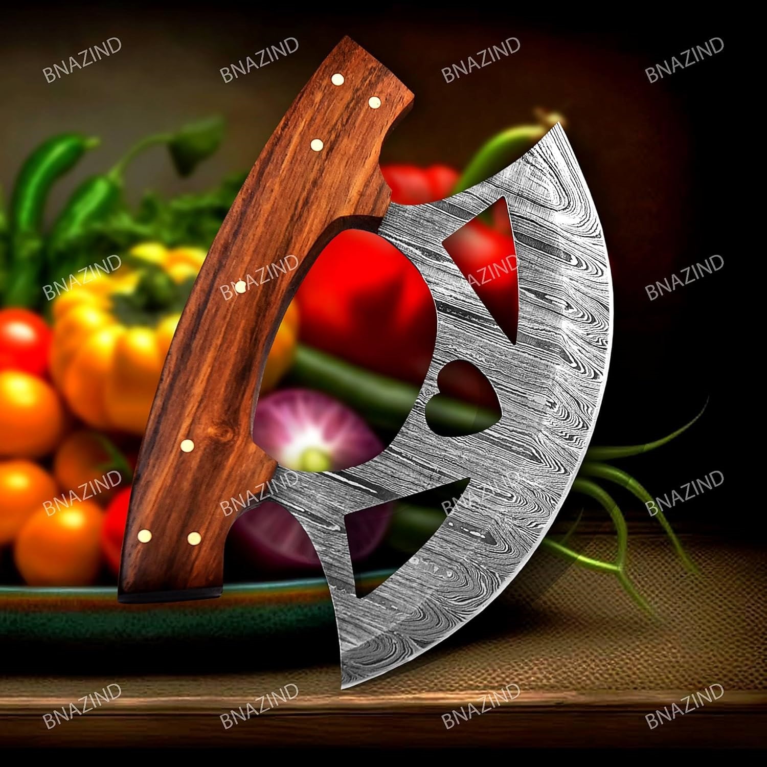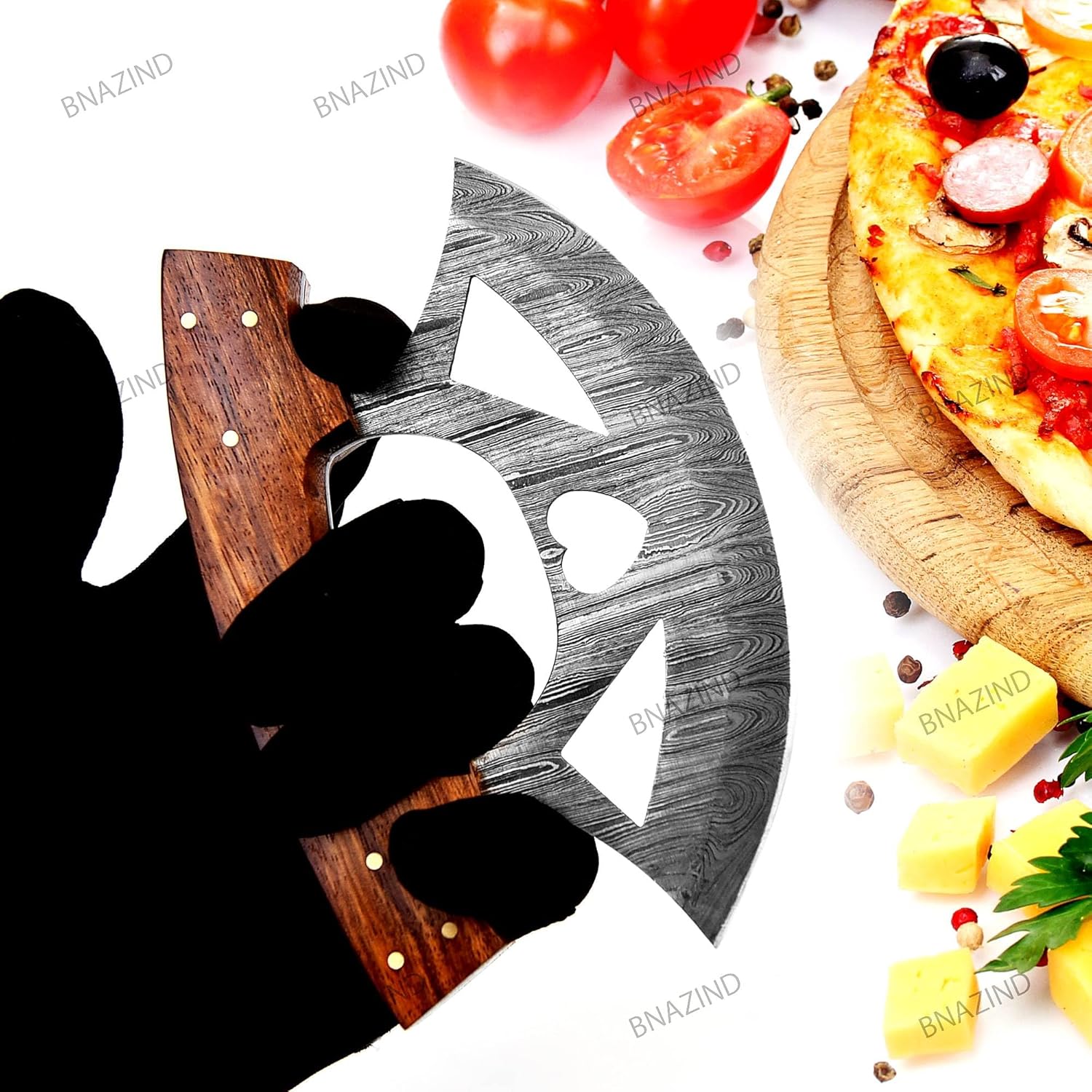 The BNAZIND ulu knife was designed having in mind the perfect combination between functionality and durability, allowing you to easily slice pizzas, dice veggies, nuts, herbs or meats while adding a beautiful vintage touch to your kitchen decor.